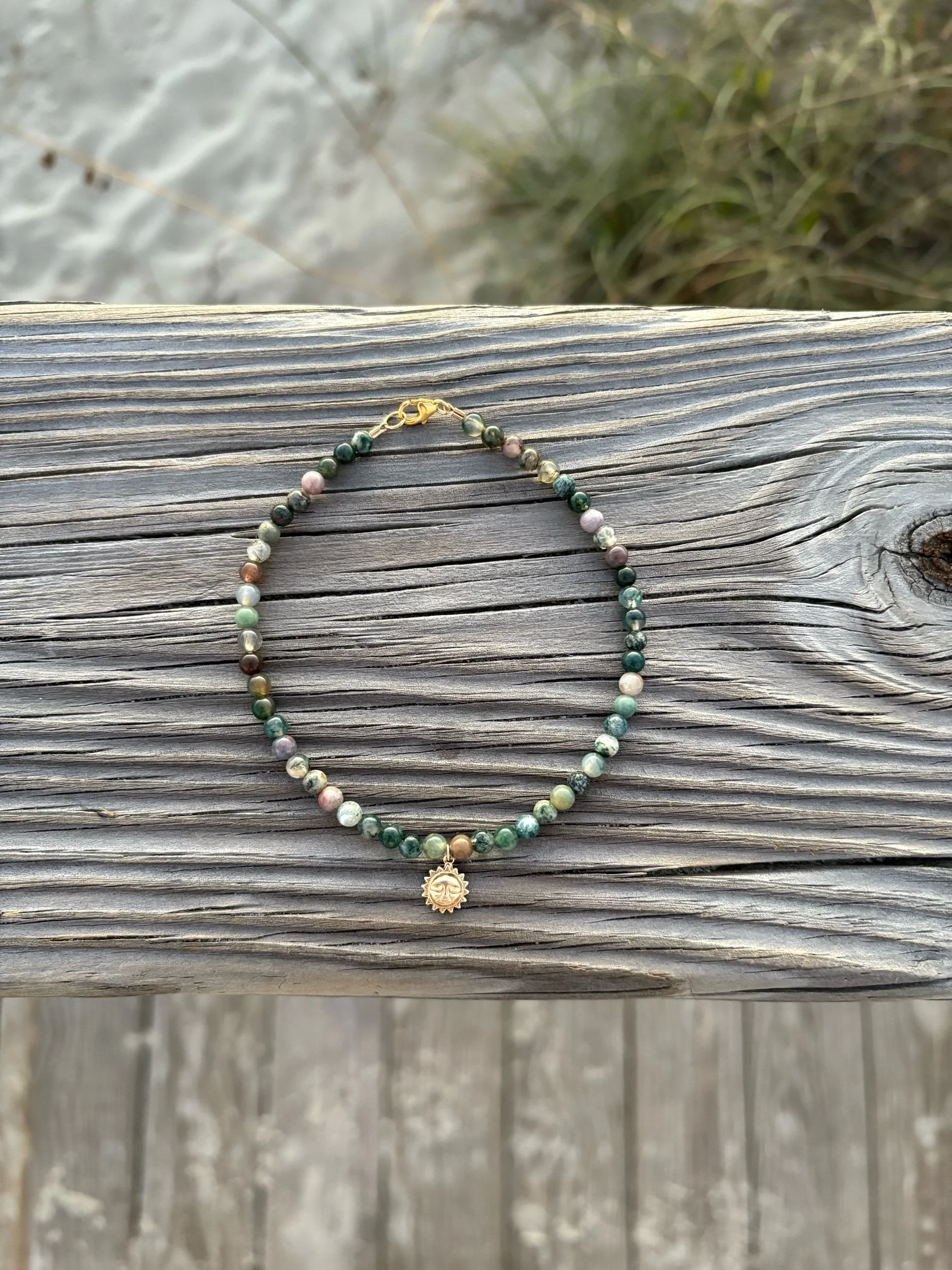 green jasper gemstone anklet with 14k gold filled sunshine charm & findings